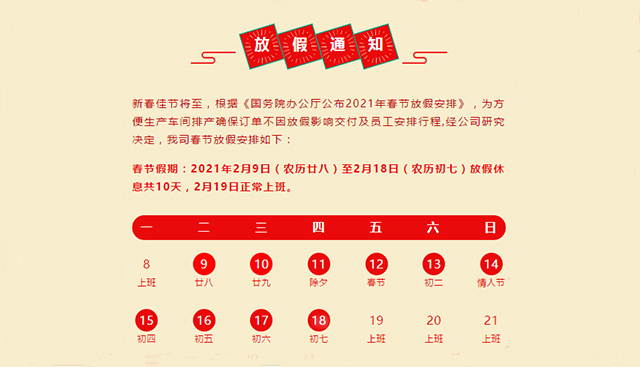 春節(jié)的腳步臨近,根據(jù)《國務(wù)院辦公廳公布2021年春節(jié)放假安排》,結(jié)合我司的具體狀況,方便生產(chǎn)車間排產(chǎn)確保訂單不因放假影響交付,經(jīng)公司研究決定,我司春節(jié)放假安排如下: